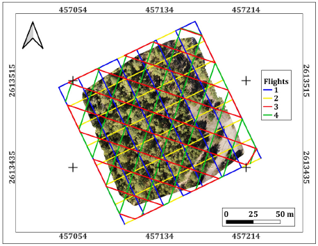 A quadruple grid was established (Figure 3), covering the study area corresponding to 1 ha. The flight height was 70 m above ground level, with an angle of 90° for the first two grids and 70° for the last two grids.