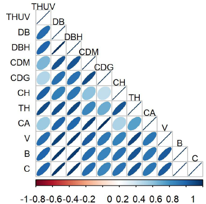 where yi is the dependent variable (THUV) vector; xi represents the matrix of values of independent variables for the studied relationships (DB, DBH, CDM, CDG, CH, TH, CA, V, B, C); βi (i = 0,1) is the vector of the intercept and slope parameters; and εi represents the error vector [εi ≈idd N(μ,g)].