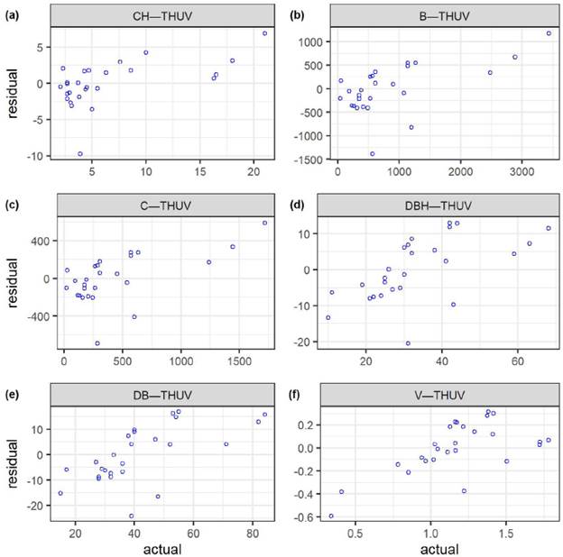 According to the fitting statistics, CH is an attribute remarkably well modelled by the THUV, with a 65% of the total variability explained by the model. Furthermore, the THUV acceptably predicted B, C, and V with R2 > 0,61, and DBH and DB with R2 > 0,57. The statistical significance values (Pr(>| t |)) strengthen the assertion (Table 2), indicating a non-random relationship. The linear relationship between the numerical predictors was also verified, where the residuals were randomly distributed around zero, with constant variability along the x-axis. The rest of the variables had no satisfactory models (Figure 6).