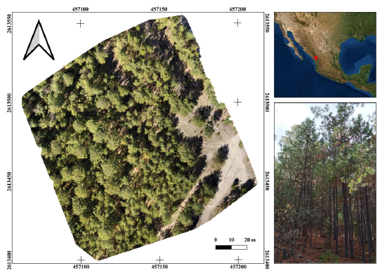 Unmanned aerial vehicle (UAV) technology has great potential as a suitable tool for the scientific community (Brede et al., 2019). Its use avoids destructive sampling and excessive time consumption, including high spatial and spectral resolutions. Previous studies in Mexico and other places around the world have used this technology in plantations, where there is a regular arrangement of individual trees (Peña et al., 2018; Gallardo-Salazar et al., 2021). However, there is limited or no research whatsoever in Mexican natural forest stands because of their structural complexity. UAVs make it possible to obtain digital images with increased spectral and spatial resolutions (Tu et al., 2019), and UAV digital color images have been increasingly applied in vegetation analysis due to their advantages (high resolution, high frequency, and easy operation) (Skorobogatov et al., 2019). Thus, information from UAV digital color images can be related with some field information for individual trees and stand variables.