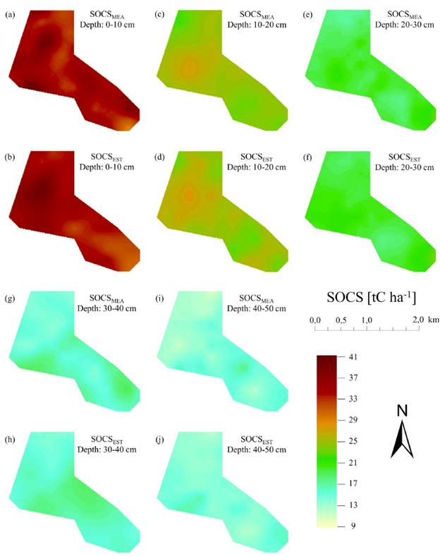 The geostatistical interpolation surfaces obtained from estimated and measured data showed a high degree of correspondence at each sampling depth. This is a positive indicator for approaching SOCS monitoring through spectral models, given that, once a sufficiently robust model is reached with adequate performance regarding the needs, the volume of information obtained could increase without the need to spend resources on conventional laboratory analyses, which is convenient for addressing soil studies in the context of climate change.