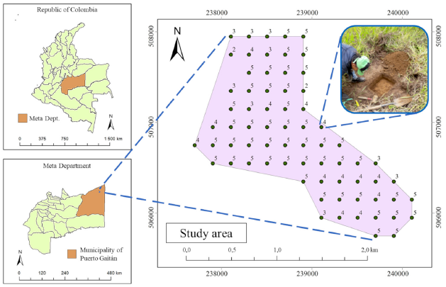 This study was carried out at the Carimagua Experimental Station of Agrosavia, located in the municipality of Puerto Gaitán (Meta, Colombia), with geographic coordinates 4° 34' 48" N, 71° 21' 00" W, an average altitude of 175 masl, an average annual temperature of 28 °C, an average rainfall of 2 240 mm, and a warm-humid climate. The relief of the study area is flat to slightly undulating, with slopes ranging between 0 and 7%. Soils are mostly oxisols whose dominant taxonomic component is typic hapludox. These soils have a low pH (<5), are well drained, and are covered with native savanna. Their predominant use is extensive livestock farming.