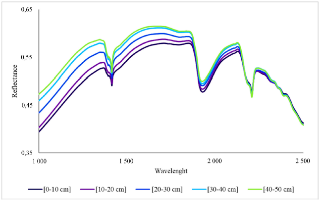 The average spectral signature for all soil samples grouped by soil depth is shown in Figure 2. The behavior shown by the spectral signatures at each sampling depth can also be qualitatively related to some of the soil properties. In the NIR, at wavelength ranges of 1 000-1 350 nm and 1 400-2 200 nm, spectral responses tend to be smoother and have a lower magnitude of reflectance in soils with a higher content of organic material (Poppiel et al., 2018). This is because organic matter affects the albedo of soils, which makes them reflect less light at higher levels of organic content (organic carbon) (Camacho-Tamayo et al., 2014). The spectral signatures obtained in this study showed a spectral reflectance according to these characteristics, as higher SOC contents were observed at lower sampling depths, which is consistent with the lower magnitudes of reflectance at a greater proximity to the soil surface.