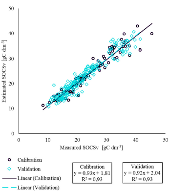 According to the RPD, the model made with the calibration group of 90 soil samples gave excellent estimates for SCOSv, with a RMSE of 2,12 gC dm-3 and a R2 of 0,93 (Figure 3). The calibration range for this model was 8,39-45,55 gC dm-3, while the range was 9,81-41,61 gC dm-3 for the validation group. The behavior of the measured and estimated SCOS in the soil profile is shown in Table 4. No large differences between the measured and estimated SOCS were evidenced. The datasets showed similar magnitudes regarding the mean and median, as well as for skewness, kurtosis, and the CV, which was in fact lower at each one of the sampling ranges (estimated vs. measured SOCS). The average content regarding the SOCS measured in the whole depth range of 0-50 cm was 109,28 tC ha-1. This value was 110,56 tC ha-1 for the estimated data.