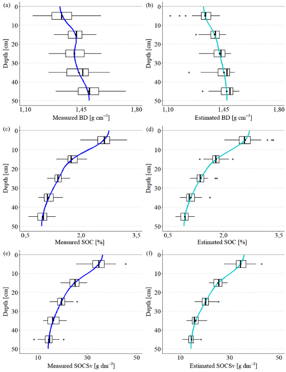 The vertical variation of the soil properties is shown in Figure 4. The splines allowed to estimate the value of soil attributes within each measured depth. Furthermore, the addition of boxplots to these diagrams aided in examining the similarity between measured and estimated data. At first glance, it can be noted that the resulting splines for BD have clear differences, which are attributed to the low representativeness of the spectral model. The interquartile range, as well as the whiskers of the boxplots, showed a considerable reduction for the estimated data in comparison with the measured values. The unrepresentativeness obtained in the spectral modeling for BD can be associated with the alteration of the structure of the soil samples prior to the signature acquisitions, as the soil samples were dried and sieved.