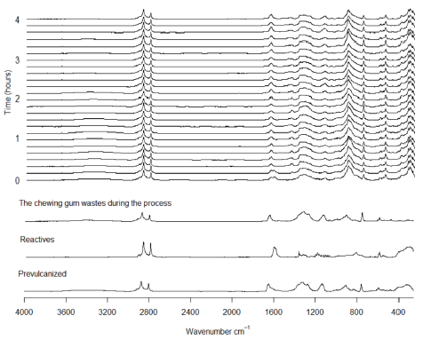 Monitoring via the ATR-FTIR spectra of the vulcanization-like process of chewing gum waste evidenced the occurrence of structural changes throughout the process, which was also proven by the distinct values of their corresponding rheometric properties, always indicating a progressive evolution in the reaction, similar to that of cross-linking in rubber vulcanization.