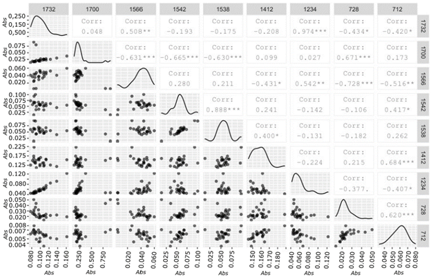 It is very common to use the Pearson correlation coefficient to quantify a possible linear correlation between two sets of data (Zou et al., 2003). This coefficient was used to analyze linearity of the absorbances of all the spectral bands chosen for this study (Jampafuang et al., 2015; slouf et al., 2018).
