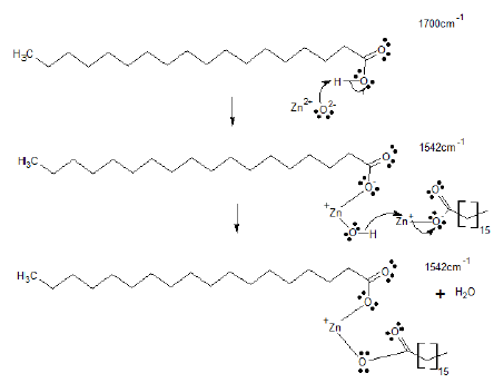 Figure 4: Reaction scheme for the zinc stearate formation related to ATR-FTIR signals recorded during the vulcanization-like process of chewing gum waste