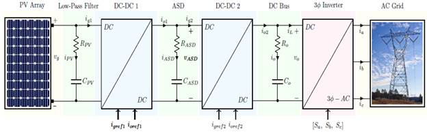 To regulate the DC bus, this study considered the SH topology described in Ramirez-Murillo et al. (2014). Unlike that work, this research used an array of solar panels as a primary source, in which an MPPT algorithm was applied in order to ensure maximum power extraction. It is essential to highlight that the development of an on-grid-type microgrid requires the design of DC voltage control loops, in conjunction with controlling the active power injected into the grid via an inverter.