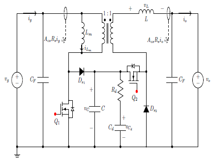 The averaged model of the converter is represented by a set of differential equations that consider the damping network and the turns ratio n = 1, as described in Erickson and Maksimovic (2007), where d1 and d2 correspond to the cycles of the switches Q