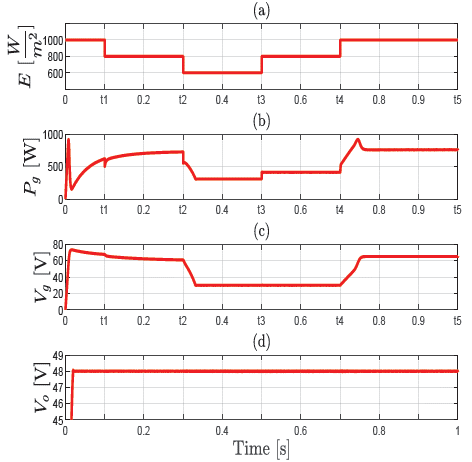 In Figure 5c, once the irradiance decreases, the voltage also decreases, until it stabilizes at V gmin = 30 V, as shown for the time interval from t2 to t4, which regulates the PV array voltage at the minimum operating value. On the other hand, from t4 to t5, when the irradiance increases to 1000 W/m2, the panel voltage reaches 65 V in order to provide the total demanded power. In Figure 5d, the DC bus voltage behavior is shown at the reference value of V oref = 48 V and under a 3, 3 Ω constant load, maintaining this state regardless of variations in demanded power and irradiance.