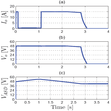 Figure 7a shows a saturation of the current reference 7gref1 = 16 A, with an initial constant load of 3, 2 Ω until t = 0, 1 s. Then, from t = 0, 1 to t = 1, 1 s, the maximum ASD voltage VASDm„x exhibits the required performance, while a load shedding is deployed, considering a constant load of 100 Ω. On the other hand, from t = 1, 1 s onward, the load is fully reconnected and shows an adequate behavior in the current output. Finally, Figure 7b shows the DC bus voltage drop V oref , while the ASD minimum reference voltage V ASDmin achieves the reference value in Figure 7c.