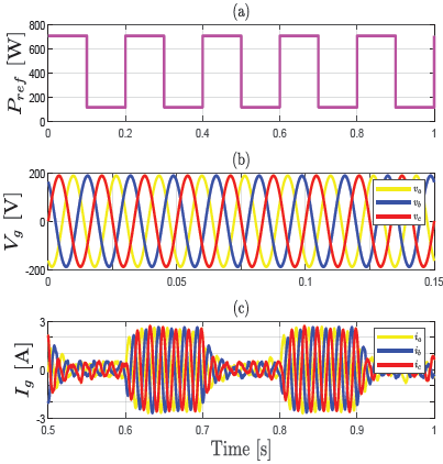 In this scenario, the dynamics of the DC system are included using a square signal, whose maximum and minimum values correspond to 768 and 115, 2 W, respectively. This profile is shown in Figure 8a, whuch includes the active power control loop mentioned in the previous section. Figures 8b and 8c illustrate the three-phase voltages (Vg = [va, vb, vc]T) and currents (Ig = i a , i b, i c ]T) after considering the DC dynamics.