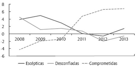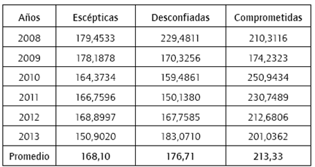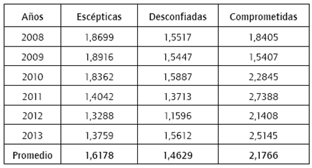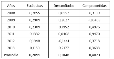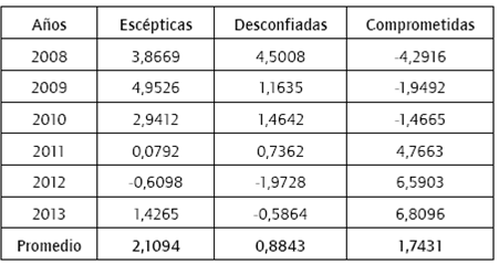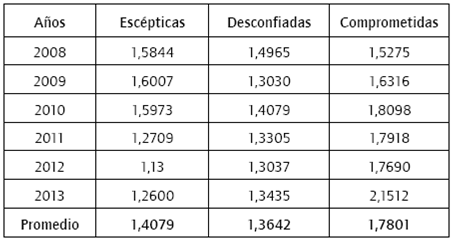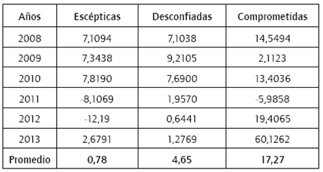 Son igualmente las empresas comprometidas las que alcanzan mejores índices de creación de valor medido a través del crecimiento en ventas (3,66%), frente al -4,99% de las empresas desconfiadas y el -7,15% de las escépticas, lo que puede observarse en la tabla 3. No obstante, hemos de señalar con respecto a esta variable que, si bien en el periodo considerado muestra un comportamiento dispar en los diferentes ejercicios, un rango de datos más amplio nos permite generalizar dicho comportamiento en mayor medida (2001-2013).