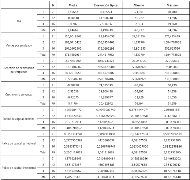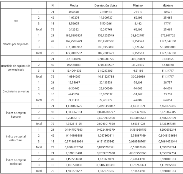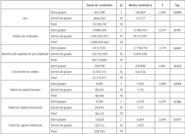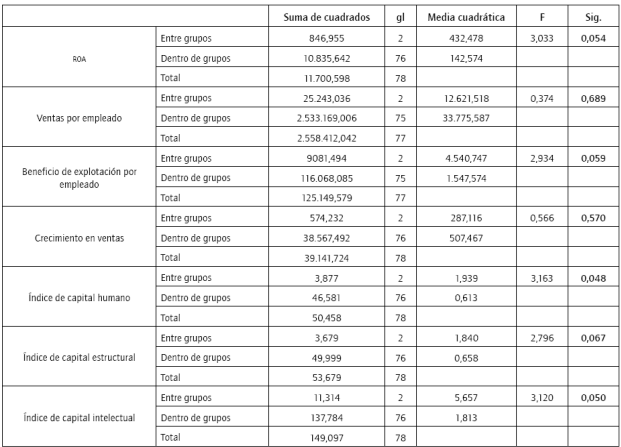 Este análisis para el 2012 revela que existen diferencias estadísticamente significativas entre las medias de los grupos en relación con las siguientes variables: roa (F = 3,033; p < 0,10), beneficio de explotación por empleado (F = 2,934; p < 0,10), índice de capital humano (F = 3,163; p < 0,05), índice de capital estructural (F = 2,796; p < 0,1) e índice de capital intelectual (F = 3,120; p = 0,05).