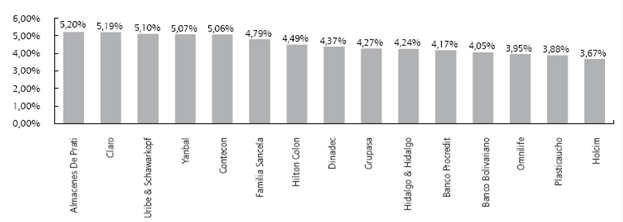Gráfico 2: Primeros 15 grupos económicos estudiados con mayor porcentaje de impuesto a la renta causado. Fuente: SRI (2016b).