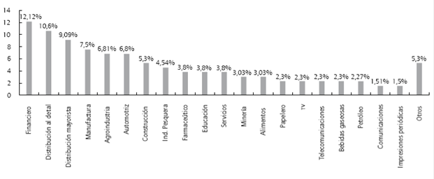 En dicho sentido, el gráfico 4 presenta la participación relativa de los ce que emplean la estrategia de concentración en los diversos sectores donde participan. En ellos se destacan, por su predominio, los grupos financieros, distribución minorista, servicios y automotriz como los de mayor participación.