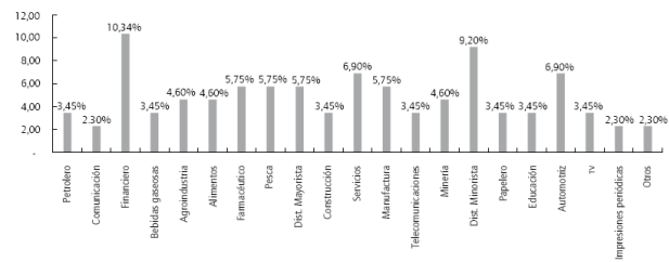 Otro aspecto analizado fue la participación de los CE por sectores industriales, para lo cual se los clasificó de acuerdo a la actividad con la que aparecen registrados en la SC. Fueron 20 los sectores industriales que conformaron la muestra de estudio. En la categoría otros, con 5,3% de participación, se identificaron grupos en el negocio de la cerveza, aerolíneas, transporte, servicios portuarios, hotelería e inmobiliarias (gráfico 3).