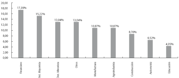 Con la finalidad de identificar la participación relativa de los CE que implementan la estrategia de diversificación, el gráfico 5 presenta los sectores en los que estas empresas compiten y donde se identificaron ocho sectores predominantes.