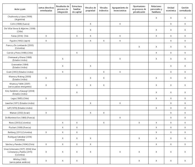 En la tabla 1 hay diez categorías que se replican en mayor o menor medida. De ellas sobresalen, por su mayor presencia, unidad económica y gestión centralizada, que a su vez se pueden considerar, con base en lo anterior, como características generales de los conglomerados. Una tercera categoría es relaciones personales y familiares, que se considera relevante por encontrase presente en un alto porcentaje en dicho análisis, concordando con los tres puntos de convergencia previamente analizados.