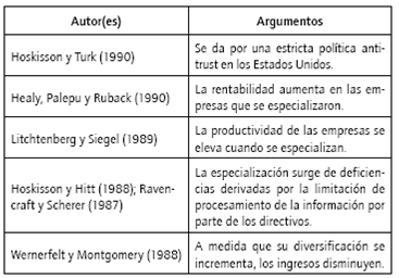 Se reconocen cuatro formas básicas que la especialización puede adoptar: 1) explotar una tecnología en particular, 2) satisfacer las necesidades específicas de los clientes o centrarse en un segmento concreto, 3) proporcionar un producto estándar a diferentes tipos de clientes y 4) retirarse o abandonar las actividades deficitarias (Strategor, 1995). Cuando las empresas están en un contexto económico desfavorable, se pueden poner en práctica medidas correctivas, con el fin de restablecer una adecuada estructura financiera (Tarzijan, 2013). Estas acciones se realizan a través de abandono de las actividades no rentables y reorientación o concentración de recursos en un sector (Medina, Sepúlveda y Rojas, 2009). Así, es posible especializarse a través de dos caminos: 1) el geográfico, que consiste en "llevar a cabo las elecciones de expansión o de restricción en el mercado pertinente que circunscribe la extensión en el espacio del área de negocio de la empresa" (Strategor, 1995, p. 133), y 2) el de producto-mercado, consistente en "seleccionar pares de productos y mercados, cuyos factores clave de éxito sean idénticos en el negocio" (Strategor, 1995, p. 133). En la tabla 2 se pueden observar algunos de los principales aportes sobre las implicaciones de la estrategia de concentración en las empresas.