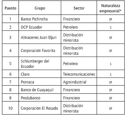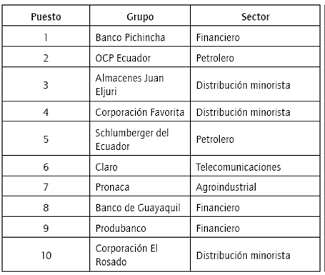 Con la promulgación del reglamento para la aplicación de la Ley de Régimen Tributario Interno, desde el 2007 los CE presentes en Ecuador comienzan a ser identificados, categorizados y ranqueados de acuerdo con una serie de variables, entre las que se destacan: 1) aportación al impuesto a la renta, 2) impuesto al valor agregado (IVA), 3) impuesto a la salida de divisas, 4) impuesto a los consumos especiales, y 5) impuesto a los activos en el exterior. Al cierre del 2015, los diez primeros CE representaban el 14, 9% del pib1 (sri, 2016b). Esto ratifica lo expresado por Leff (1978): no solo su conformación empresarial los hace importantes, también lo hacen sus aportes al producto geográfico bruto.