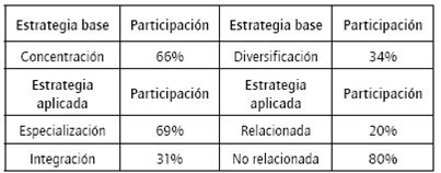 Se consideraron las dos estrategias de crecimiento predominantes: la de concentración y la de diversificación. Para el primer tipo, se dividieron las empresas en las que se implementan las estrategias de concentración por especialización y las de concentración por integración. Para el segundo tipo, las empresas fueron divididas en aquellas que realizaban una diversificación relacionada y las que aplican la diversificación no relacionada. La tabla 5 ayudará a identificar la estrategia aplicada por cada CE.