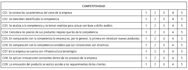 El cuestionario se diseñó en relación con el constructo presentado en la figura 1, donde se plantean preguntas para cada variable independiente que representan los factores que intervienen en cada una, donde planeación estratégica está representada por cuatro preguntas o ítems, conocimiento de mercadotecnia, por siete, estrategias de marketing, por diez y, finalmente, la variable dependiente competitividad, representada por nueve (anexo 1).
