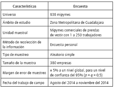 Para la realización del estudio empírico, se definió una muestra de 380 empresas mipymes del sector comercio al menudeo (de prendas de vestir) de la zmc, habiéndose aplicado a 403 empresas, de las que se descartan 23 por no estar completa su información. La muestra utilizada ha sido definida según los principios del muestreo estratificado en poblaciones finitas (Santesmases, 2009).