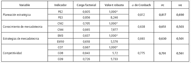 Así mismo, para esta investigación se utilizaron los estadísticos robustos (valor t robusto), para la proporción de una mejor evidencia de los ajustes estadísticos. Con respecto a la carga factorial, algunos autores (Kline, 2011; Albright y Winston, 2015) señalan que las cargas estandarizadas para cada ítem de la escala empleada deben ser superiores a 0,7, a pesar de que un valor superior a 0,5 también es aceptable. Por esta razón, todas las cifras arrojadas por este estudio presentan valores arriba de los 0,6, que son valores aceptables.