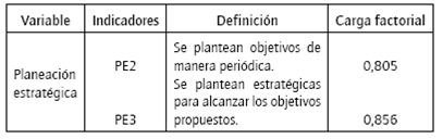 Finalmente, después del ajuste del modelo y una vez que los ítems con menor carga factorial fueron descartados, quedando los factores restantes adecuados al constructo del modelo que se valida en las ecuaciones estructurales, los indicadores que más contribuyen a explicar cada una de las variables antes señaladas se exponen a continuación. En relación con la variable planeación estratégica, los ítems más representativos se muestran en tabla 3.