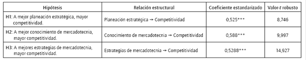 De esta manera, en la tabla 7 se muestra el resultado de las hipótesis de la investigación. Para el caso de este constructo, se obtuvieron tres hipótesis que dieron los siguientes resultados: con respecto a H1, los resultados obtenidos (3 = 0,525, p < 0,001) indican que la planeación estratégica tiene efectos positivos significativos en la com-petitividad de las mipymes de comercio, mientras que para H2, los resultados obtenidos (3 = 0,588, p < 0,001) indican que el conocimiento de mercadotecnia tiene un fuerte impacto en la competitividad de las mipymes comerciales; finalmente, para H3, los resultados (3 = 0,5288, p < 0,001) reflejan que cuanto mejores estrategias de mercadotecnia sean formuladas e implementadas en las empresas, mayor impacto tendrán en su competitividad.