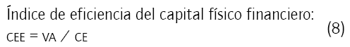 Con el fin de contar con una visión completa de la eficiencia de los recursos de creación de valor, es necesario tener en cuenta el capital físico y financiero; a pesar de perder su posición predominante en la nueva economía, su pertinencia no se puede descuidar. Es así como se integra al modelo el índice de eficiencia de este capital: