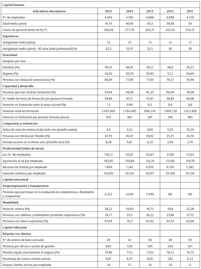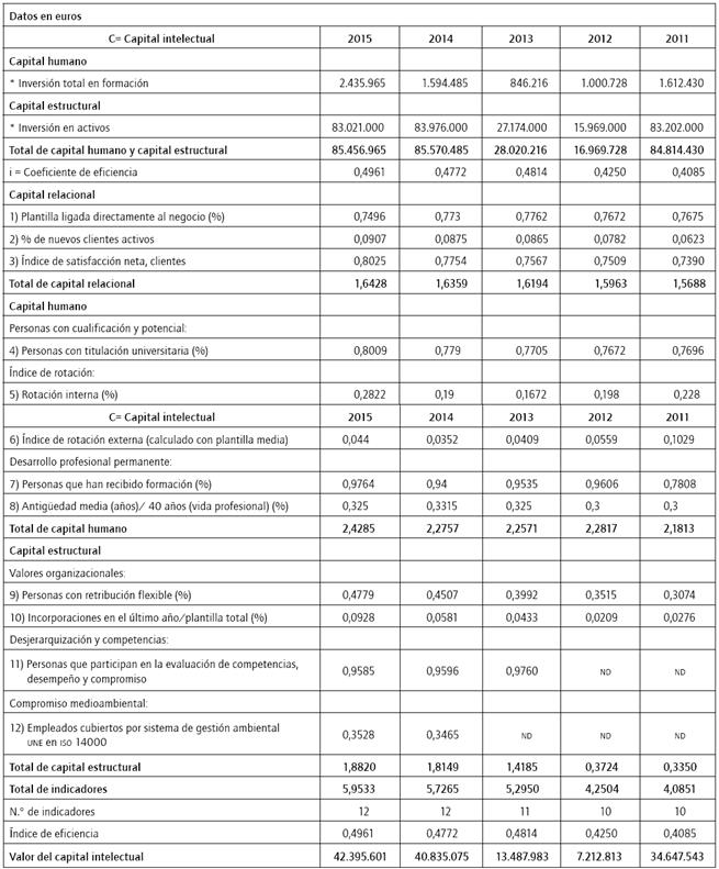 Para cuantificar el valor del ci, se utilizó la información financiera y no financiera de Bankinter, durante el periodo 2011-2015, considerando para este caso específico dos rubros: capital humano (inversión en formación) y capital estructural (inversión en activos de largo plazo) de cada año.