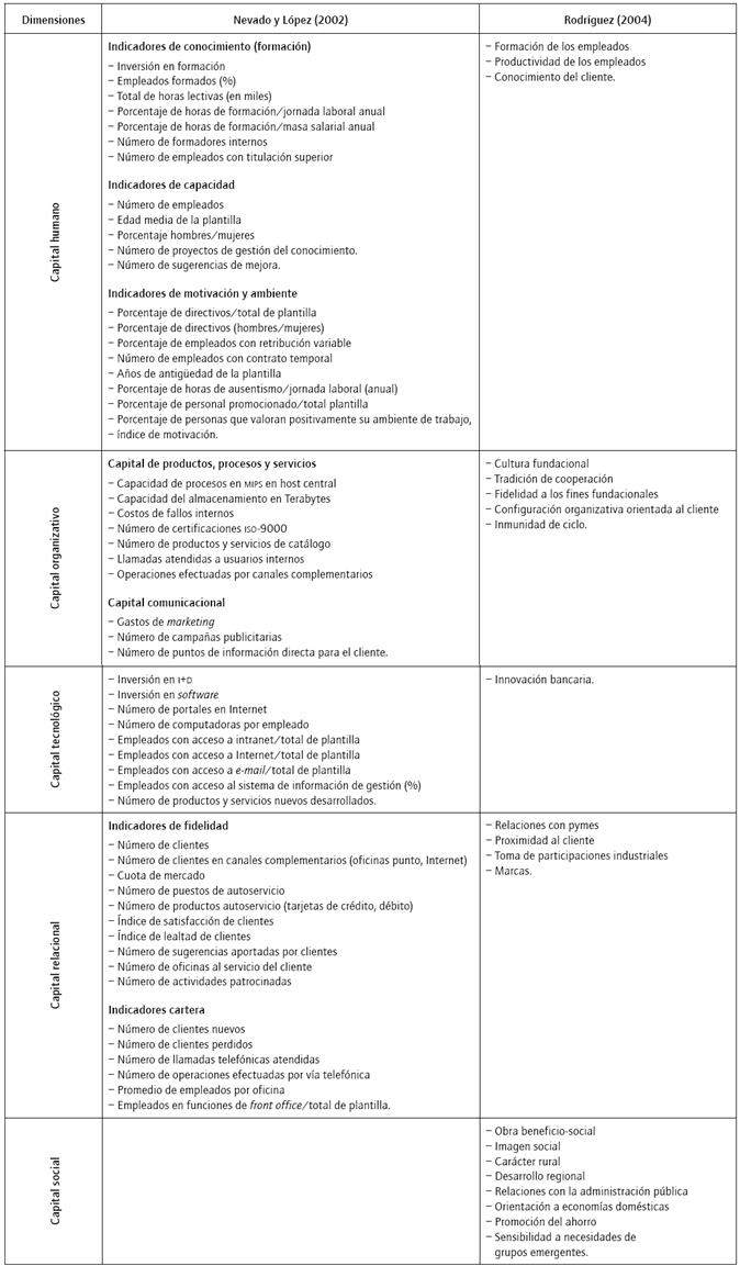 Derivadas del estudio de estas tres dimensiones, han surgido otras más que enriquecen el estudio del ci; así mismo, para cada una de ellas, se propone una serie de indicadores que conducen a la determinación de índices. Cada modelo presenta su serie de indicadores, algunas más completas que otras. Inicialmente, la compañía Skandia identificó veinte indicadores que han sido el punto de partida de otras contribuciones, como las propuestas por Nevado y López (2002) y Rodríguez (2004), que se enfocan en organizaciones de giro financiero (tabla 1).