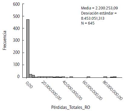 En los diferentes grupos de pérdidas por RO se presentan distribuciones de alta dispersión con rango amplio y desviación estándar muy superior a la media.