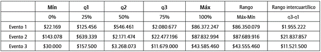 Ahora, una revisión de los cuartiles para los tres eventos se muestra en la tabla 10. De acuerdo con esta tabla, la tendencia de las pérdidas por RO siguen siendo sesgadas a la derecha de la distribución, especialmente en el evento 1; es así como, al comparar el rango intercuartílico con el rango total, la dispersión se percibe más hacia las colas, mientras que cuando se revisa la diferencia entre los valores mínimos y Q1, comparado con la diferencia entre Q3 y valor máximo, esta dispersión aparece hacia la cola derecha de las distribuciones.