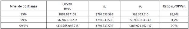 Siguiendo lo recomendado por Basilea, con un 99,9% de confianza, las diferencias son significativas para los tres eventos; los dos métodos reflejan resultados distantes, así: 120,9%, en el evento 2; 301%%, en el evento 1, y el mayor diferencial en el evento 3, con el 325%. Es decir, a mayor pérdida, mayor será la variación con un máximo nivel de confianza.