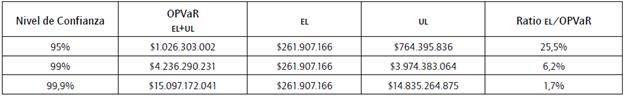 Los resultados anteriores reflejarían provisiones semestrales por pérdida operacional, utilizando el acumulado individual y el promedio para los tres eventos y los dos métodos, correspondiente a un mínimo de $2.265 millones, con un 95% de nivel de confianza; $11.942 millones con un nivel de confianza del 99%, y un escenario extremo de $123.491 millones, para el 99,9% de confianza.