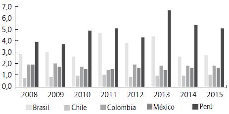 El Banco de la República (2016) también compara a Colombia con otros países, teniendo como referencia el coeficiente (RIN/SER). La conclusión es similar a la que se deriva de la gráfica 2.