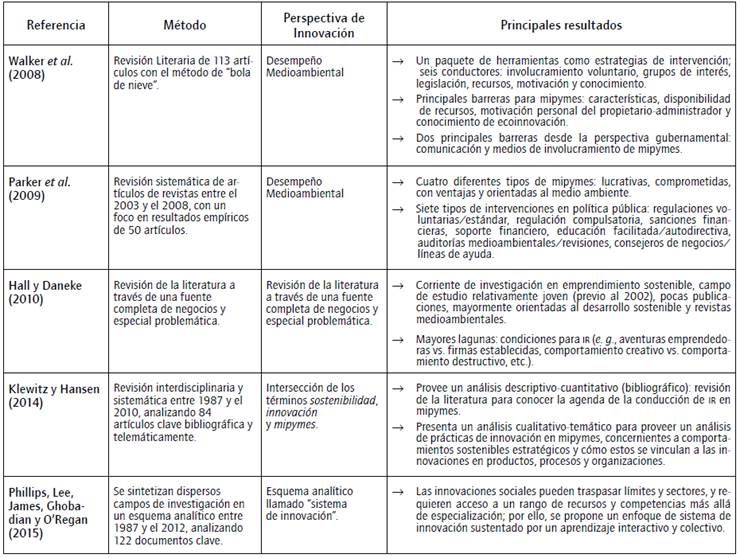 En el contexto de las mipymes, la innovación y la sostenibilidad, existen trabajos que abordan importantes estrategias que contribuyen al crecimiento económico y social de los países (Hamdani & Wirawan, 2012); igualmente, se plantea el enorme potencial innovador que tienen las mipymes para lograr la sostenibilidad de ciertos sectores (Lee, Park, Yoon & Park, 2010). Relevante es el trabajo realizado por Klewitz y Hansen (2014), quienes llevaron a cabo una revisión de publicaciones entre 1987 y 2010, identificando comportamientos de innovación y sostenibilidad estratégica de las mipymes; a través de esa investigación, establecieron niveles de apropiación y mostraron sus prácticas de innovación, en las que descubren una mayor carga hacia la dimensión ecológica por sobre la económica y social.