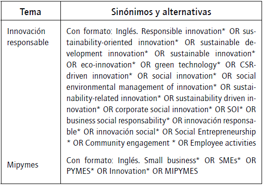 La investigación de la innovación responsable en las mi-pymes ha estado dispersa a lo largo de diferentes disciplinas y comunidades de investigación, como la gestión de la innovación, el emprendimiento sostenible, la producción limpia, la gestión sostenible y, más recientemente, la innovación social. Para lograr el objetivo de este artículo, se realizó, en primera medida, una elección y análisis de cinco artículos de revisiones sistemáticas previas, que tratan los antecedentes de la innovación responsable, cubriendo autores de diferentes orientaciones: sostenibilidad, gestión medioambiental, innovación social, gestión tecnológica y emprendimiento (tabla 1).