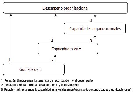 La capacidad en ΤΙ tiene un impacto significativo en el desempeño organizacional, pero indirectamente a través de otras capacidades organizacionales, entre las que se encuentran la capacidad de gestión de procesos, clientes e innovación (Nakata et al., 2008; Ynzunza-Cortés et al., 2013; Mithas et al., 2011, entre otros).