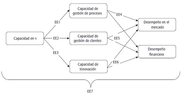 ■ EE7. La capacidad en ΤΙ está significativamente relacionada con (a) el desempeño en el mercado y (b) el desempeño financiero, pero indirectamente a través de la capacidad de gestión de clientes, procesos e innovación.