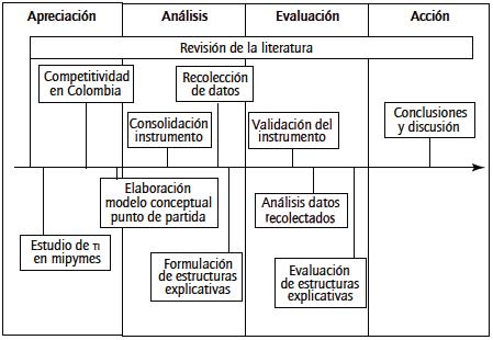 La investigación adoptó la multimetodología planteada por Mingers (2006), en la que se plantea abordar el problema a través de fases que representan un proceso. En cada etapa es posible hacer uso de diferentes métodos según se requiera: fase de apreciación, que busca describir y explicar la situación identificada con base en conceptos y teorías; fase de análisis, en la que se elaboran las estructuras hipotéticas que podrían explicar el fenómeno estudiado; fase de evaluación, a partir de la cual se verifican las alternativas que dan respuesta al problema planteado, y fase de acción, en la que se responde a la pregunta: ¿Qué hacer para cambiar? (Mingers, 2006). En la figura 3 se presentan las etapas de la multimetodología en la investigación realizada con las actividades que se llevaron a cabo en cada una de ellas.