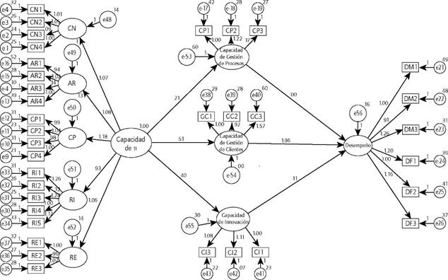 Con base en la estimación del modelo de ecuaciones estructurales, se llegó al siguiente modelo conceptual (figura 5), en el que se plantea una relación significativa entre la capacidad en ΤΙ y las capacidades de gestión de procesos, clientes e innovación, y de la capacidad de gestión de clientes con el desempeño general de la organización.