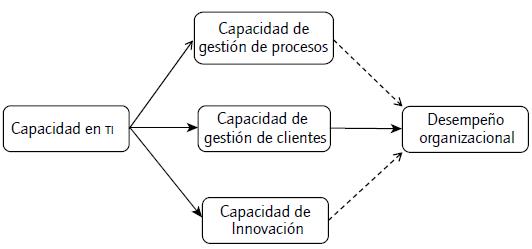 A partir de la revisión de la literatura y los modelos estudiados, se plantea un modelo conceptual para evaluar la posible relación entre la capacidad en τι y el desempeño de la organización vía otras capacidades organizacionales (figura 2).
