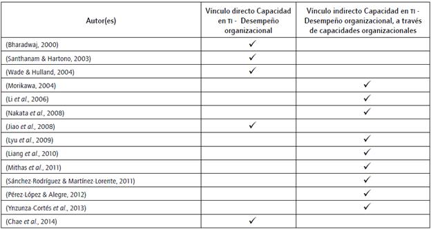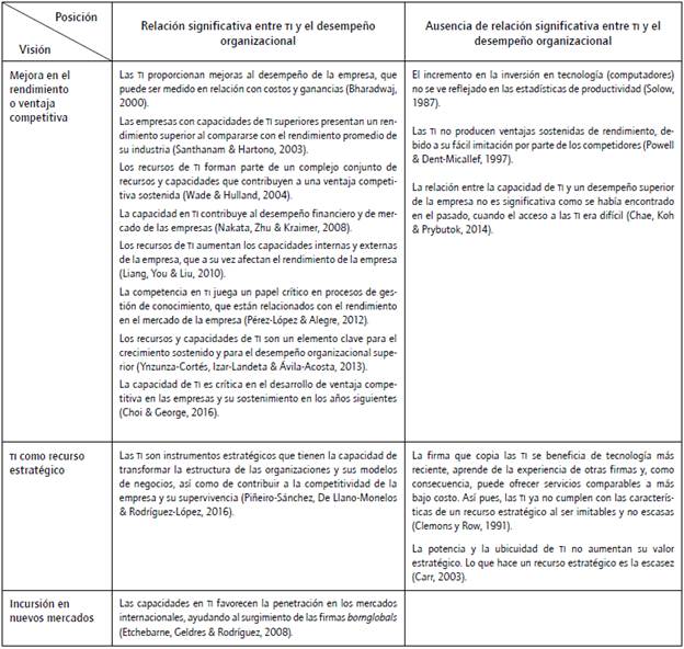 En la literatura académica se encuentran diferentes posiciones con respecto a la relación de las TI con el desempeño de la organización: aquellas que sugieren la existencia de una relación, ya sea directa o indirecta, y aquellas que manifiestan la ausencia de tal relación (tabla 1).