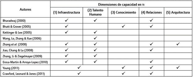 Existe un consenso en la literatura respecto a la multidimensionalidad de la capacidad en TI, en la que se identifican, entre otras, las siguientes dimensiones: (1) la infraestructura tecnológica; (2) las habilidades de las personas en la solución de problemas haciendo uso de TI; (3) el aprovechamiento de las TI en las oportunidades de negocio; (4) la relación del personal de TI con personas de otras áreas de la organización y con los proveedores de TI, y (5) la planeación estratégica de las ti dentro de la organización (tabla 3).