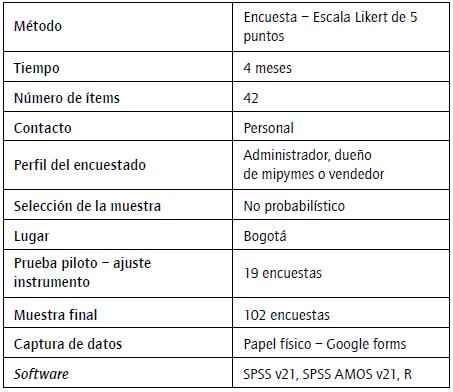 Posterior al análisis de la literatura, se elaboró el modelo propuesto como punto de partida con sus correspondientes estructuras explicativas. Asimismo, se construyó el instrumento para la recolección de la información en las mipymes, a partir de una herramienta para medición de la capacidad en ΤΙ ya elaborado y validado en Colombia (Rodríguez, Espinosa, Díaz & Peña, 2013), de un conjunto de preguntas seleccionadas del modelo colombiano de excelencia en la gestión y de instrumentos empleados en estudios similares, con el fin de realizar la aproximación a las capacidades organizacionales y el desempeño, que se puede consultar en el anexo 1. En la tabla 7 se presentan los datos detallados de la recolección de información.